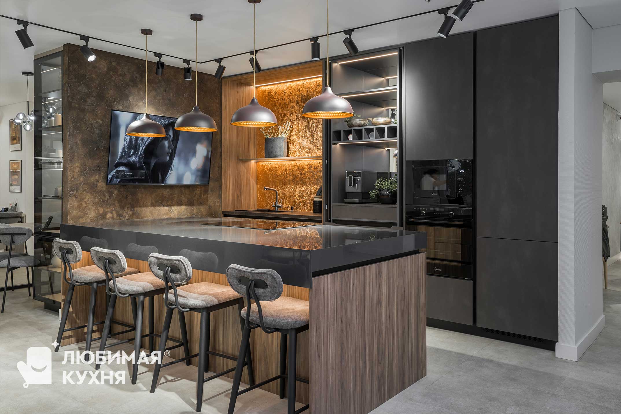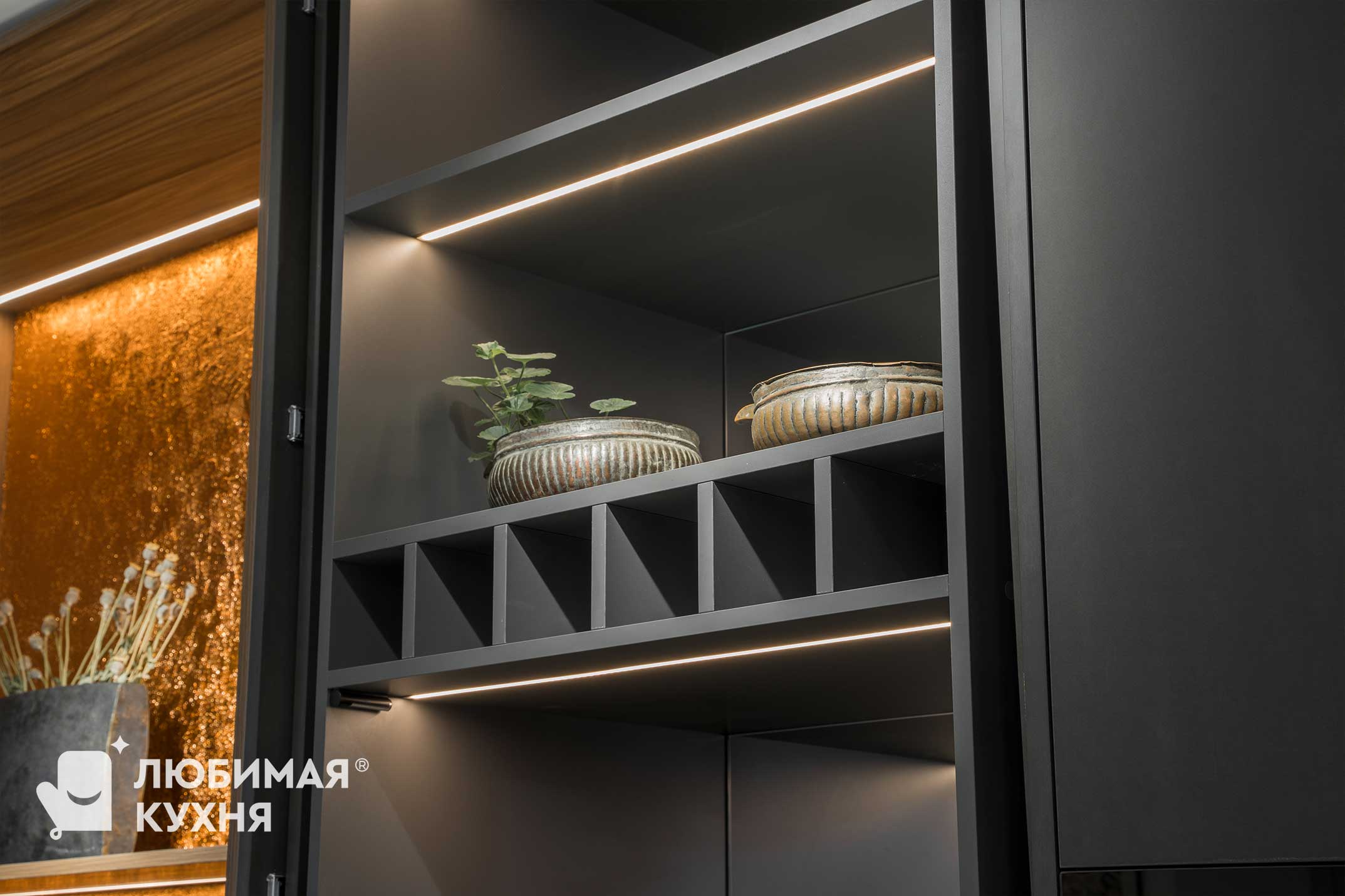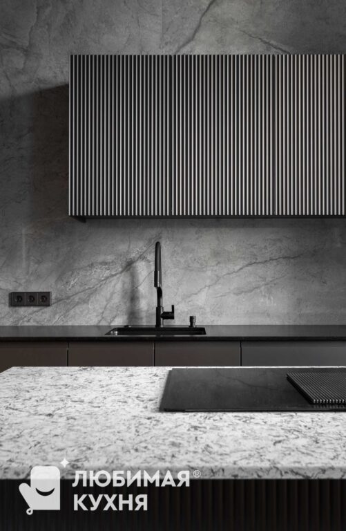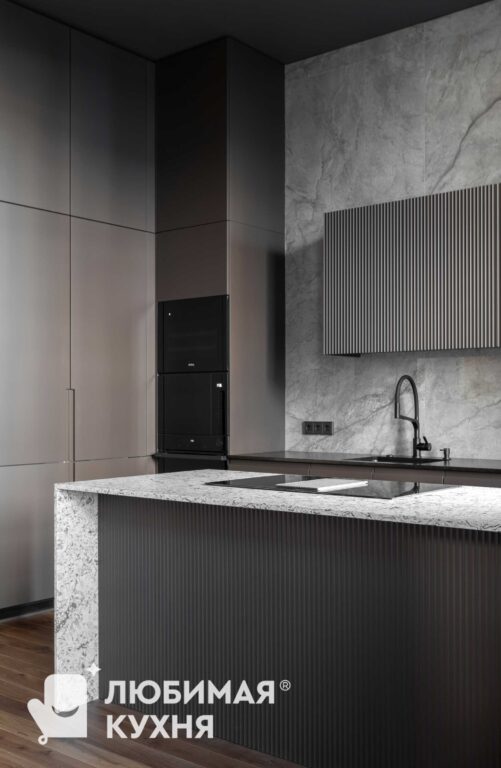 Шикарная кухня для ценителей сложных текстур, цветовых сочетаний и внимательных к деталям. Небольшая зона с мойкой, совмещенная с невероятно вместительными пеналами, в которых разместились полки для хранения различной утвари, от кофемашины, до столовых приборов и колонны со встроенной техникой. Композицию завершает большой и вместительный остров, с одной стороны которого предусмотрена зона готовки с варочной панелью, а с другой зона приема пищи и отдыха.