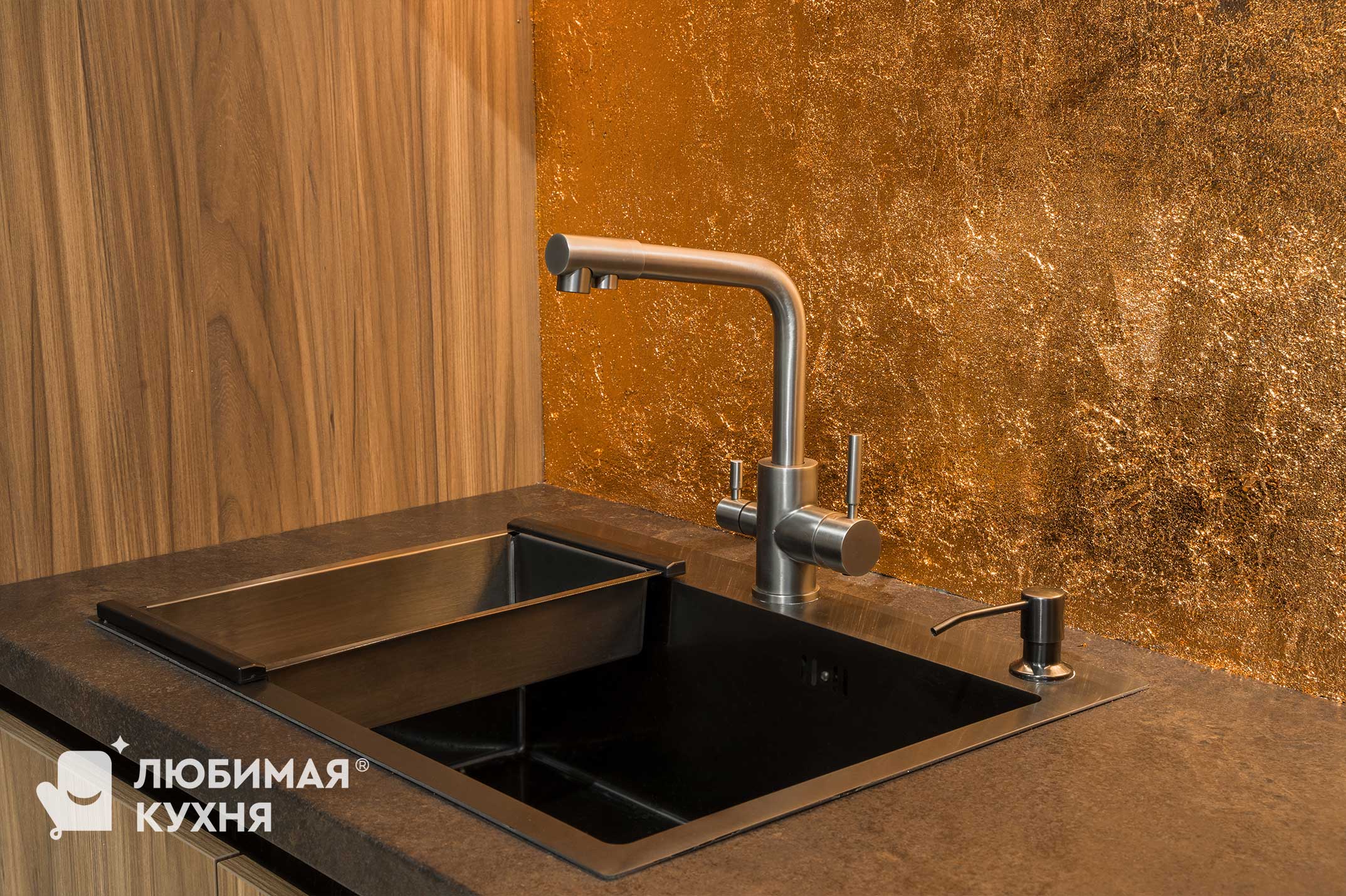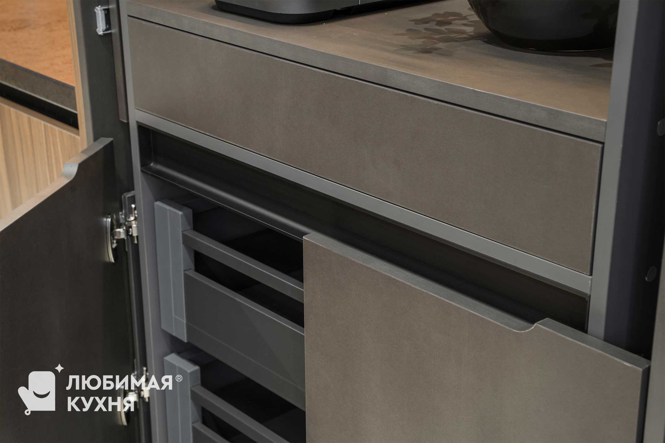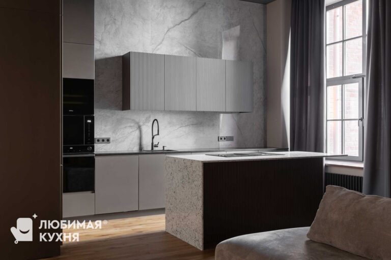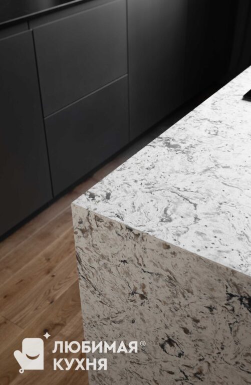 Шикарная кухня для ценителей сложных текстур, цветовых сочетаний и внимательных к деталям. Небольшая зона с мойкой, совмещенная с невероятно вместительными пеналами, в которых разместились полки для хранения различной утвари, от кофемашины, до столовых приборов и колонны со встроенной техникой. Композицию завершает большой и вместительный остров, с одной стороны которого предусмотрена зона готовки с варочной панелью, а с другой зона приема пищи и отдыха.