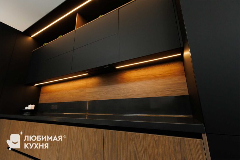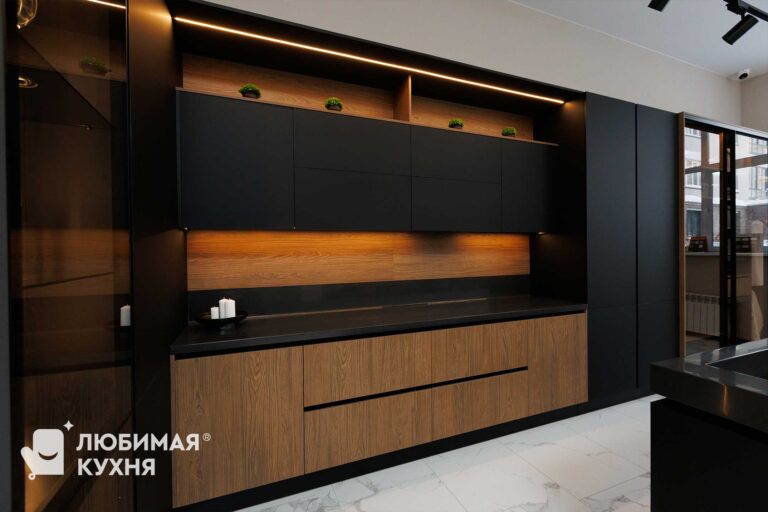 Данная кухня, никого не оставит равнодушным! Глубокие, сочные оттенки данной модели создают контрастное, сложное сочетание. Конфигурация кухни, спроектирована очень удобно — мойка со смесителем на полуострове, напротив варочная панель, а встроенный холодильник в пенале.
