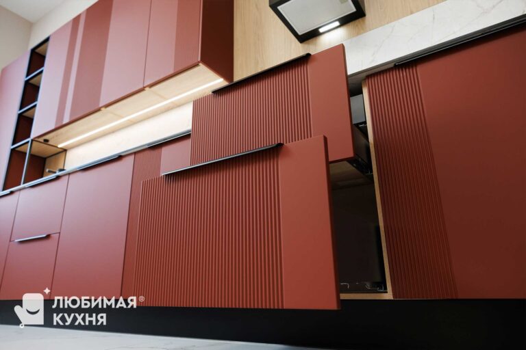 Кухня выполнена в современном минималистичном стиле с акцентом на контраст фактур и света. Матовые тёмные фасады сочетаются с тёплым древесным оттенком, создавая уютную и статусную атмосферу. Открытые ниши с декоративной подсветкой добавляют глубину и визуальную динамику, подчёркивая архитектурность композиции. Лаконичные формы и скрытые ручки делают интерьер строгим, стильным и функциональным.