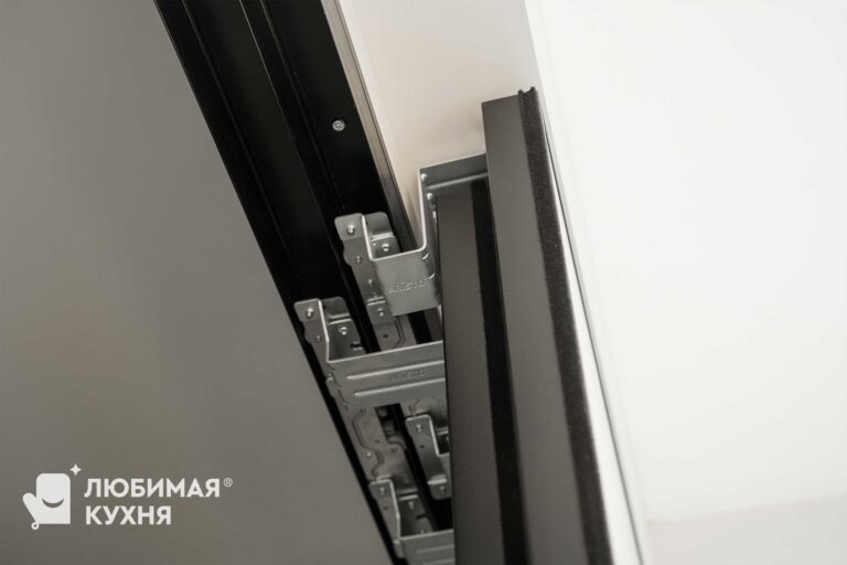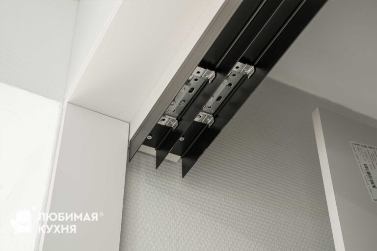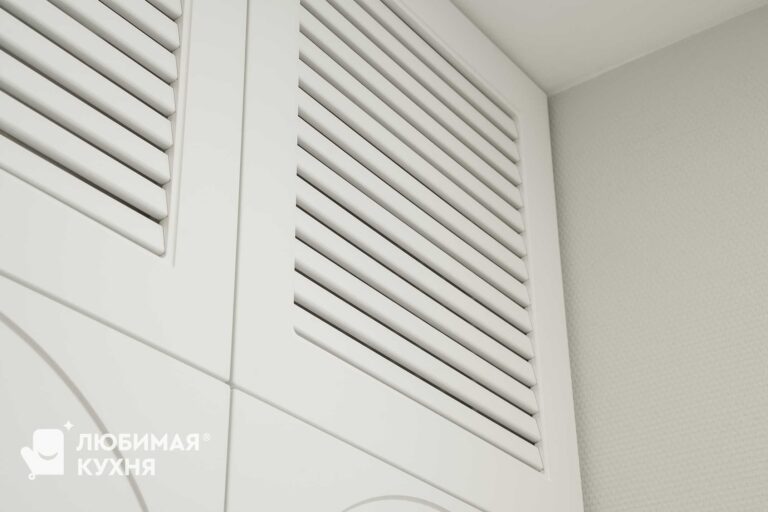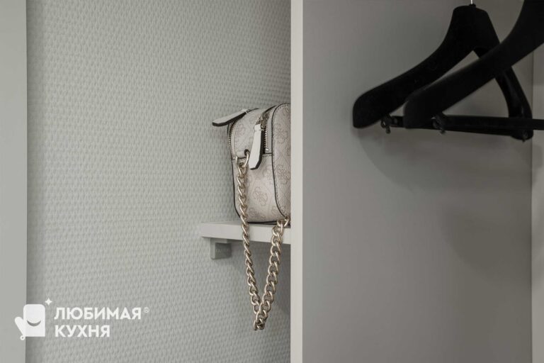 Встроенный угловой шкаф для большой семьи, внутри секция со штангой для одежды, три ящика с направляющими полного выдвижения. Шкаф состоит из трех отделений. В первом отделении антресольная полка и штанга для длинных вещей. Во втором отделении антресольная полка и двухуровневая секция для коротких вещей. В третьем отделении полки по всей высоте шкафа с тремя ящиками полного выдвижения.