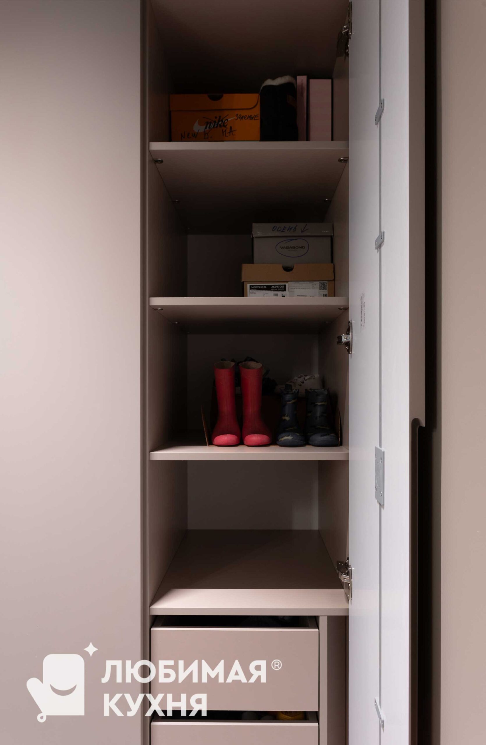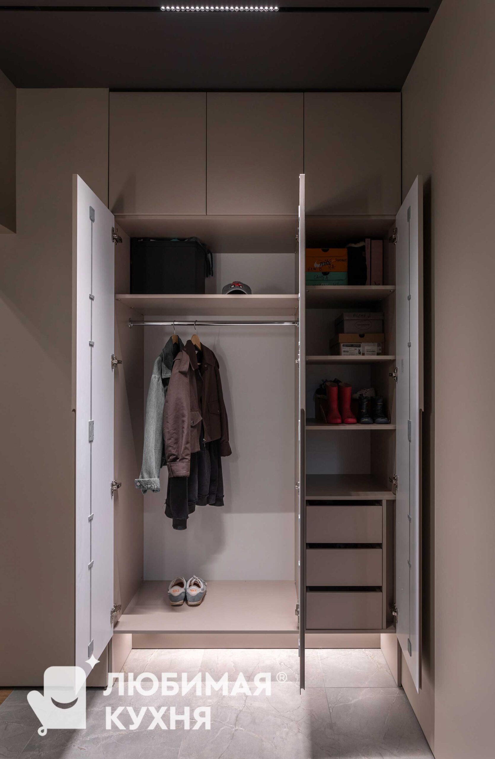 Искусство утонченного минимализма. Серо-коричневые матовые фасады шкафов создают монолитное пространство, сливаясь со стенами. Удобные и стильные ручки, которые вырезаны в фасадах и создают дополнительный ритм. Фишкой данного шкафа является его подвесная конструкция, которая образует пространство под шкафом с подсветкой для размещения обуви.