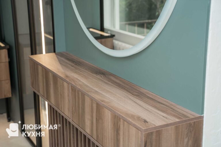 Стильная гардеробная, невероятно вместительная и продуманная до мелочей. В полках предусмотрена подсветка, для отличного обзора вещей даже без основного освещения. Системы хранения — полки,ящики,сетки, все продумано для комфортного расположения различных вещей вашего гардероба.